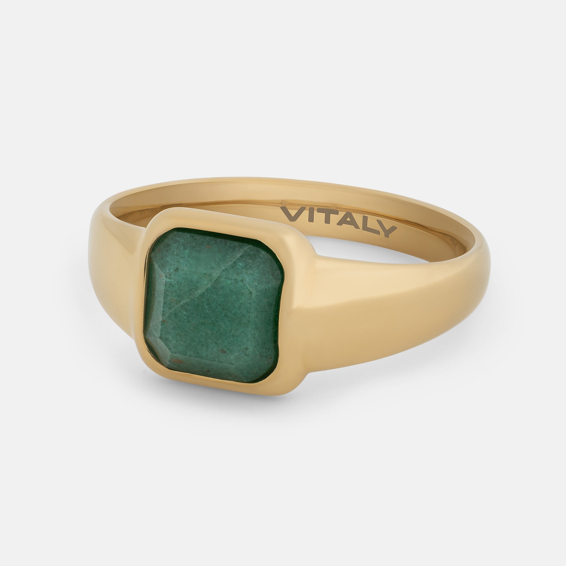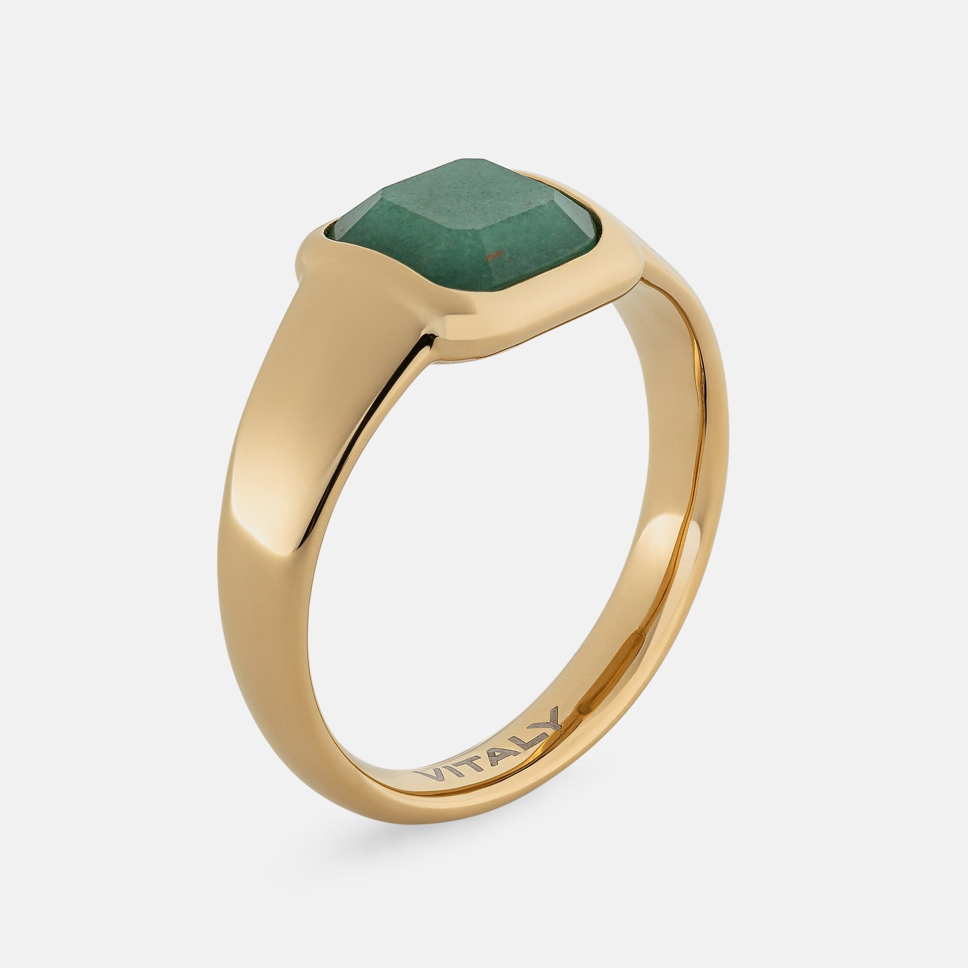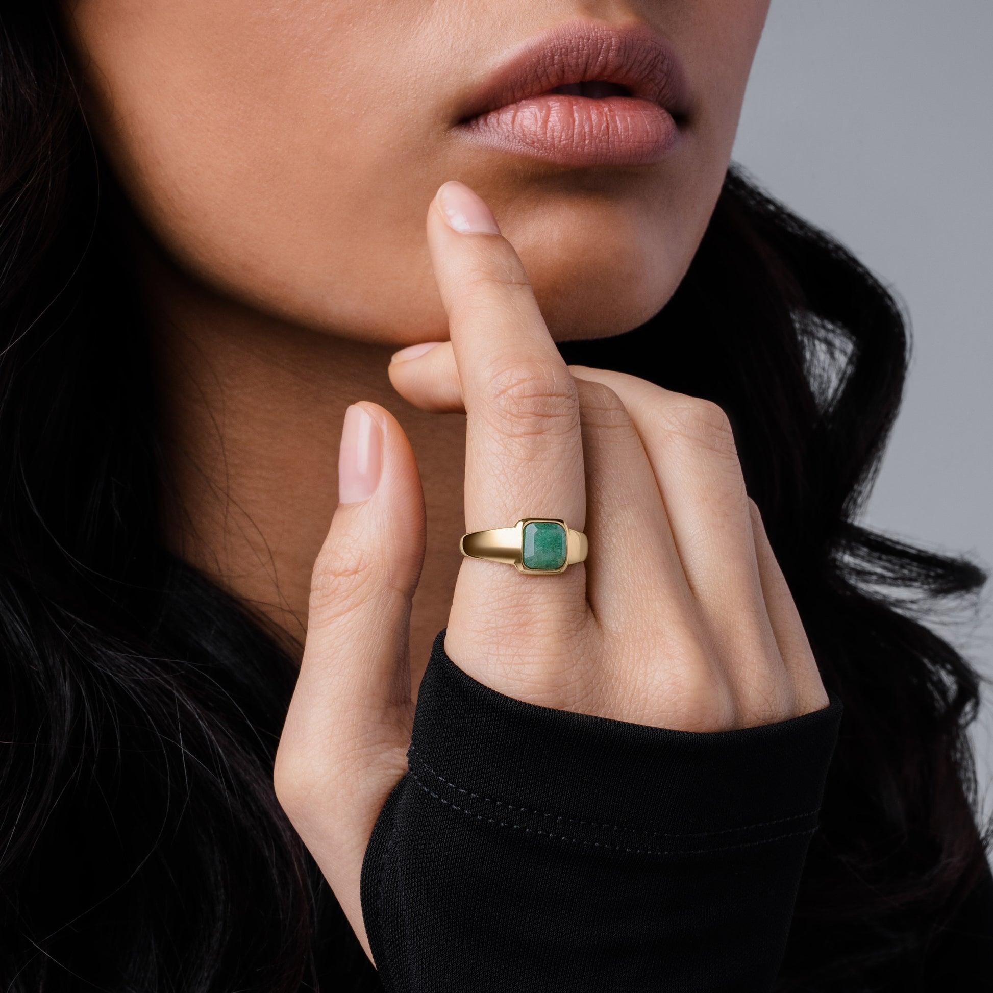 The Haze is a minimalistic signet ring adorned with either a green aventurine or black onyx stone, housed in a geometric casing that looks best when worn on the pinky or index finger.